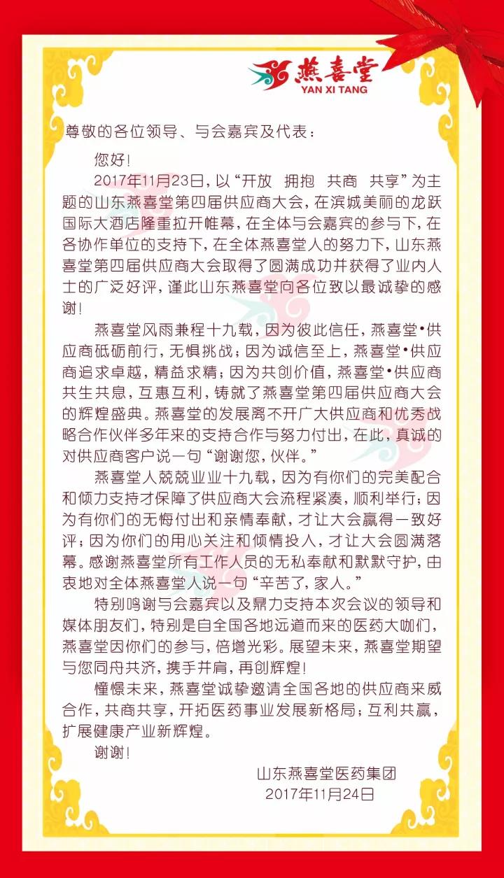 山东燕喜堂第四届供应商大会感谢信