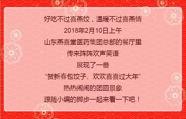 迎新春事事如意,接鸿福步步高升。值此新春佳节来临之际,山东燕喜堂医药集团管理者们齐聚公司总部餐厅包水饺、迎新年,为辛勤工作的员工们送上亲手包制、饱含情意的饺子和最富真意、喜庆祥和的新春祝福,点点滴滴注入着暖心的味道!