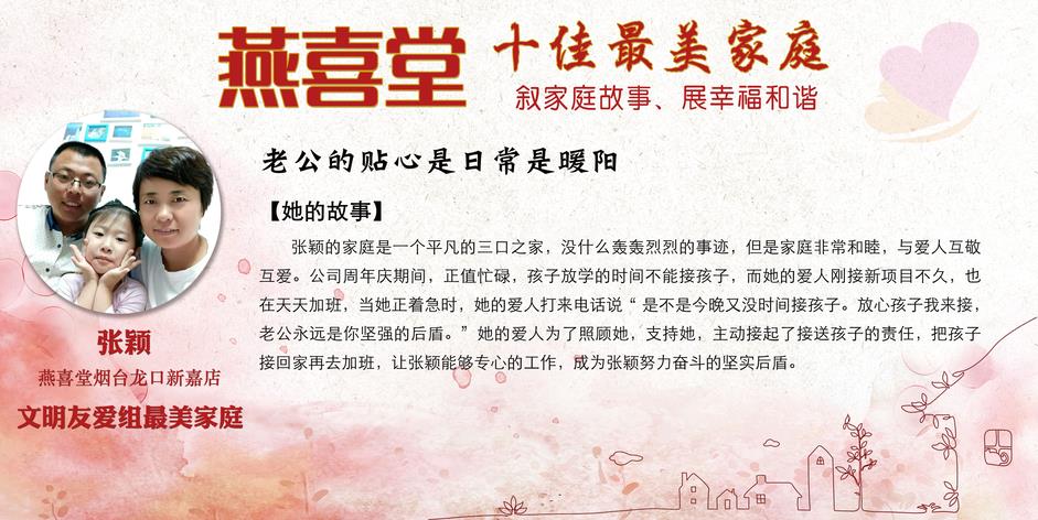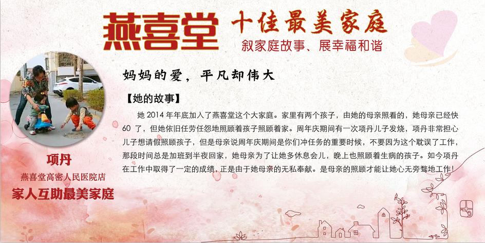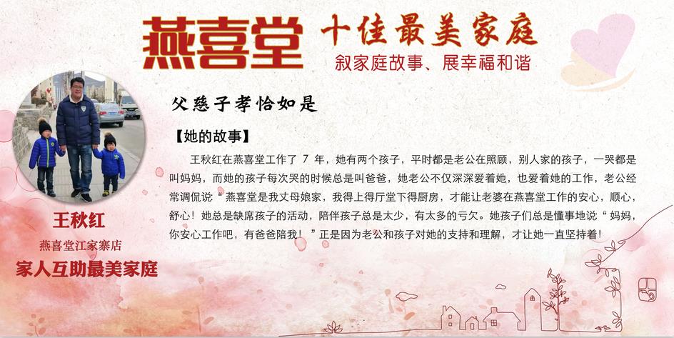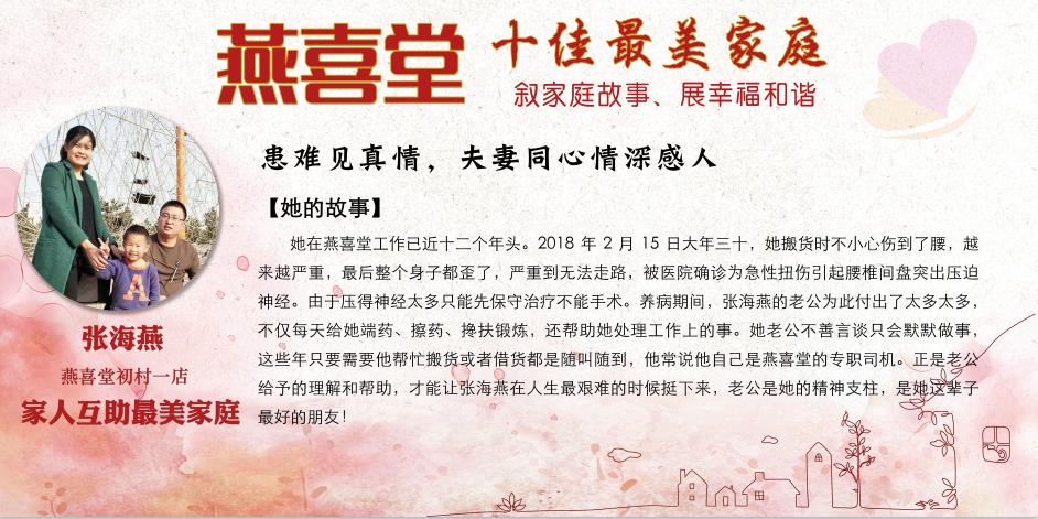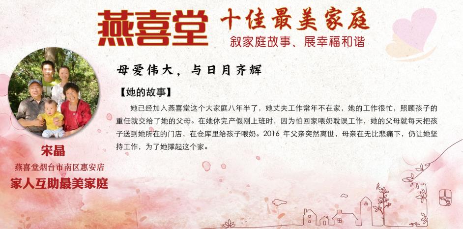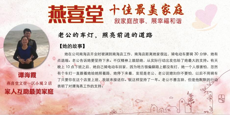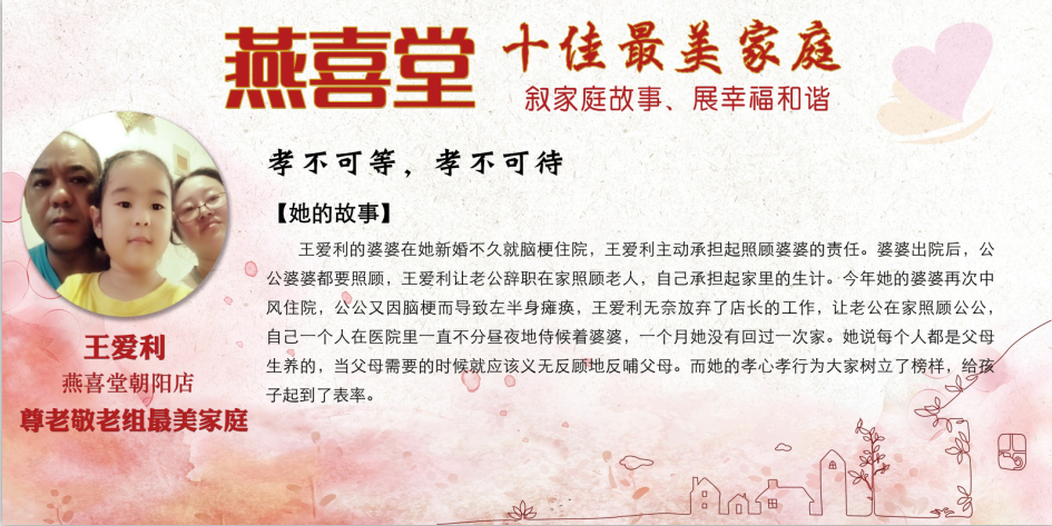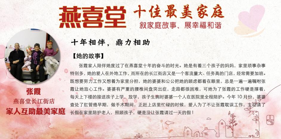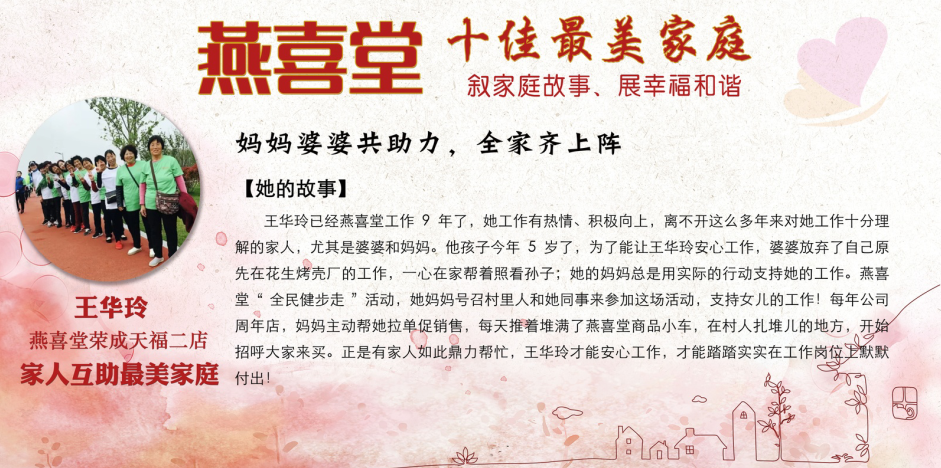 这些感人的故事展现出燕喜堂员工家人对员工工作的全力支持和付出,展现出尊老敬老的传统美德,展现出家庭和睦的和谐氛围,更展现出燕喜堂员工积极向上的精神风貌,忠于工作、无私奉献、任劳任怨的可贵品质。她们是3000多名燕喜堂普通员工生活的缩影,正因为有家人的鼎力相助,才成就了可以全身心拼搏奋斗的燕喜堂人,成就了如今的燕喜堂。在中华民族的传统文化中,家——这一生生不息、薪火相传的精神力量早已融入在了每个中华儿女的血脉之中。愿我们每个人都家庭和睦,愿我们每个人家人平安,愿燕喜堂这些美好的故事能温暖你我~