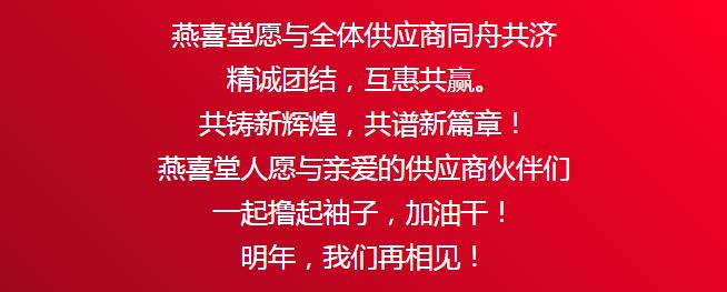 燕喜堂坚持合作精神,继续加强团结,深化务实合作,携手为各合作伙伴谋求增长,为完善相互合作提供动力。燕喜堂坚持共赢精神,在追求各自公司利益的同时兼顾长远发展,做到惠民、利市,走出一条合作共赢、良性发展的道路。