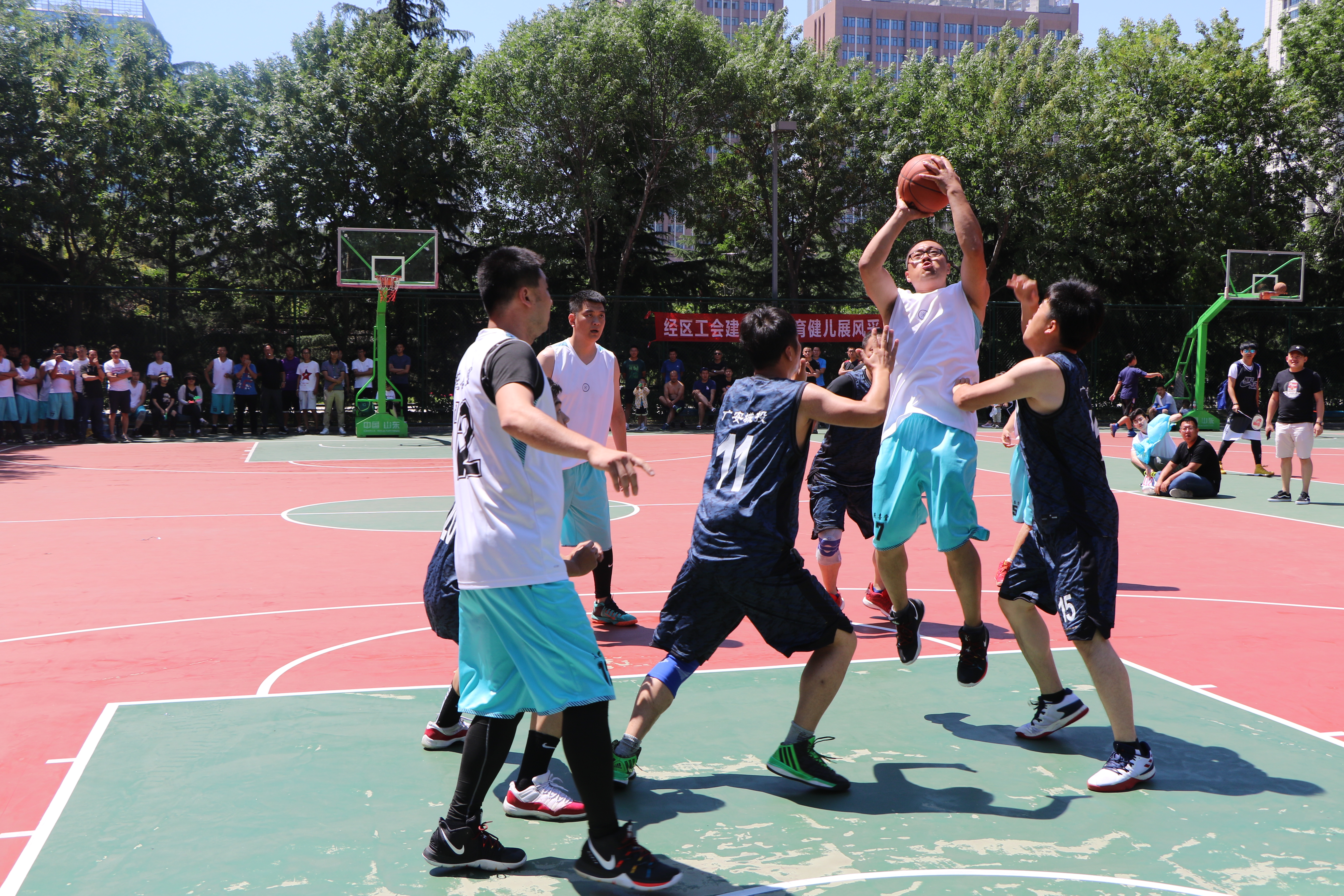 队员们积极进攻,严密防守,精彩配合,巧妙的抢断,不时将比赛气氛推向高潮。尽管天气炎热,但队员们个个激情满怀、斗志高昂。现场气氛也异常活跃,欢呼声、呐喊声让篮球比赛气氛不断升温。